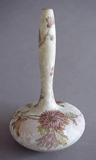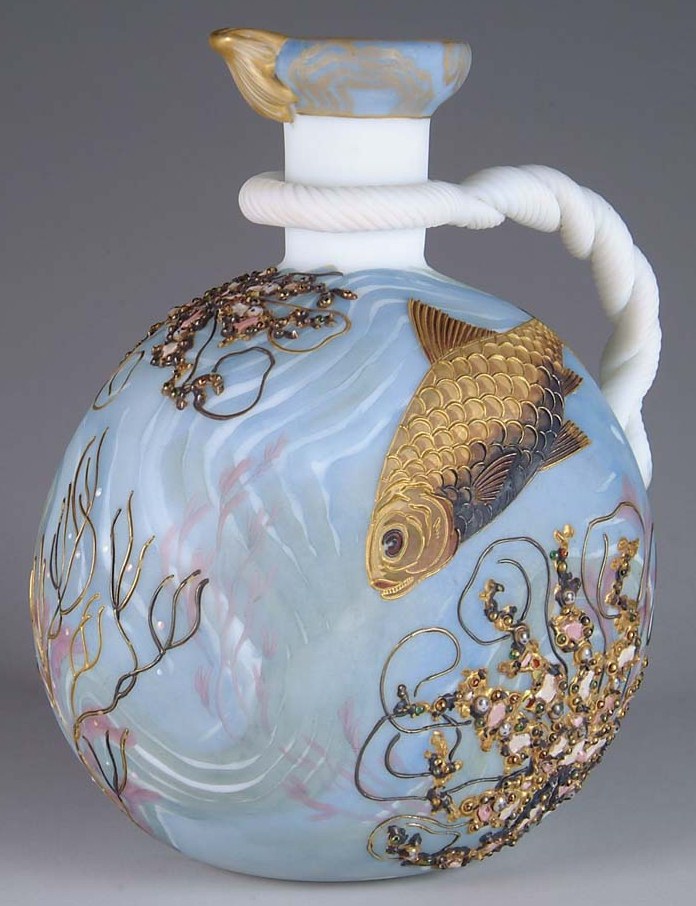 Long story short, if Mt. Washington made it, they probably used it for Crown Milano. Expect to find lots of biscuit jars, pitchers, fluted and or bulbous vases. Generic and inexpensive examples will just have a simple floral decoration. The valuable pieces tend to feature fish, butterflies, birds, crabs, dragons, people, etc. The list is very long. Below are just a few examples of some really nice Crown Milano pieces.